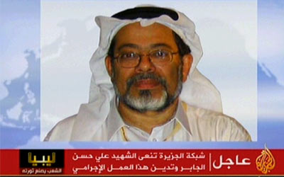 من جانبه، أكّد المدير العام لشبكة الجزيرة، وضاح خنفر، أن "الجزيرة لن تسكت على هذه الجريمة وستلاحق مرتكبيها قانونيا وجنائيا"، مشدداً على أن "الزميل على الجابر تم اغتياله نتيجة حملة تحريض غير مسبوقة من جانب النظام الليبي على الجزيرة والعاملين بها".