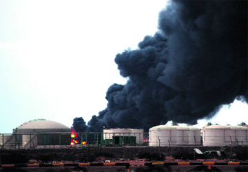 النيران تلتهم خزان نفطي في راس لانوف جراء المعارك. أ.ف.ب