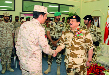 حمد بن عيسى أثناء لقائه ضباط درع الجزيرة. أ.ب