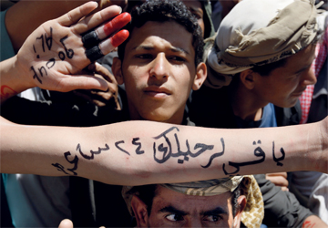 يمنيون كتبوا على أذرعهم لصالح «ارحل». أ.ف.ب