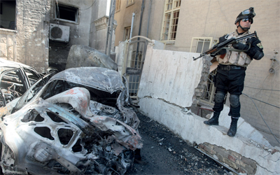 جندي عراقي أمام حطام سيارة إثر تفجير في أحد شوارع بغداد. أ.ف.ب