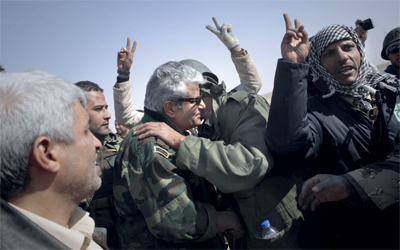 اللواء عبدالفتاح يونس قائد القيادة العسكرية (وسط) مرحباً به بين الـــــــــــــــــــــــــــــــــــثوار عند مدخل البريقة. أ.ب