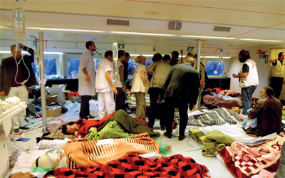 ورست سفينة تابعة لمنظمة اطباء بلا حدود الخيرية في ميناء صفاقس التونسي وتحمل 71 مصاباً من مصراتة، ومن بينهم عدد كبير مصاب بطلقات نارية وكسور في الاطراف وشوهت الحروق وجه احد المصابين تماماً.