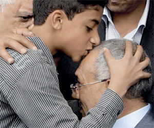 طفل يمني من المؤيدين يقبّل رأس صالح. رويترز