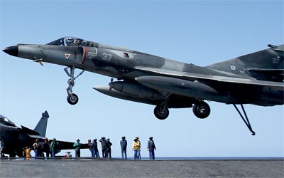 مقاتلة تهبط على حاملة الطائرات الفرنسية «شارل ديغول» بعد مهــــــــــــــــــــــــــــــــــــمة فوق ليبيا. أ.ب