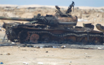 إحدى دبابات القذافي التي دمرها قصف التحالف. أ.ف.ب