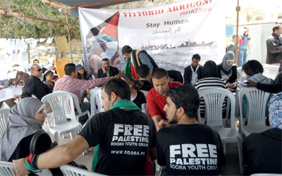 فلسطينيون يجلسون في خيمة عزاء لاريغوني بغزة. أ.ف.ب