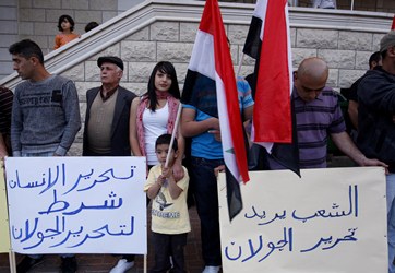 متظاهرون في قرية مجدل شمس المحتلة من قبل إسرائيل يطالبون النظام السوري بـ"تحرير الجولان" عبر "تحرير الانسان"-أ.ف.ب