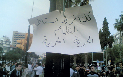 تجمع لمحتجين في دوار الساعة بمدينة حمص قبيل إقرار الحكومة مشروع قانون ينظم التظاهر السلمي. رويترز