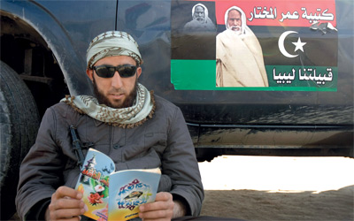 أحد الثوار يقرأ كتاباً بجوار سيارة مسلحة في مدخل أجدابيا. أ.ف.ب