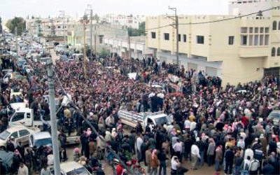 وتفصيلا، قتل أمس خمسة أشخاص في درعا (100 كلم جنوب دمشق)، وخمسة في دوما (15 كلم شمال دمشق)، وثلاثة في دمشق خلال جنازات التشييع التي ضمت عشرات الآلاف. وقال شاهد وناشط حقوقي في دوما اتصلت بهما «فرانس برس»، هاتفيا، إن خمسة أشخاص على الأقل قتلوا برصاص قناصة متمركزين على سطوح المباني لدى مرور موكب مشيعين كان متوجها الى مسجد المدفن. وفي درعا حيث انطلقت حركة الاحتجاجات منتصف مارس الماضي، أفاد ناشط آخر بسقوط خمسة قتلى عندما أطلقت قوات الامن الرصاص الحي على الاشخاص الذين كانوا يتوجهون الى إزرع للمشاركة في التشييع وكذلك امام مستشفى درعا. وقال ناشطون إن ثلاثة اشخاص على الأقل قتلوا برصاص قوات الأمن في حي برزة في دمشق.