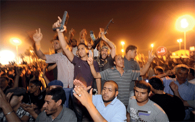 الثوار خلال تظاهرة في بنغازي للتنديد بالتفجير الذي شهدته المدينة أول من أمس. أ.ف.ب