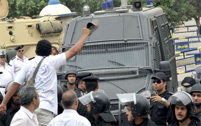 احتجاج غاضب في وجه سيارة شرطة تقل العادلي. أ.ب