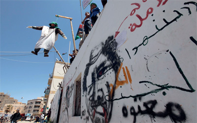 ليبيون يثبتون شكلاً تعبيرياً عن شنق القذافي. رويترز