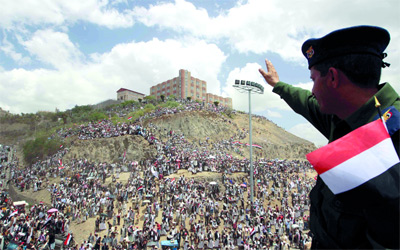جندي يمني يلوّح بيده محيياً آلاف اليمنيين في ذكرى إعادة الوحدة التي وافقت أمس. رويترز