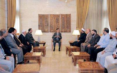 صورة نشرتها وكالة «سانا» تُظهر الأسد خلال اجتماع مع رجال دين من درعا. إي.بي.إيه