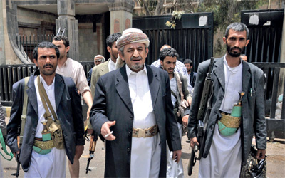 صادق الأحمر زعيم قبيلة حاشد وسط حرّاسه بالقرب من منزله في حي الحصبة بصنعاء. أ.ب
