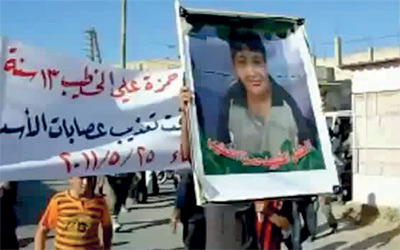 تظاهرة في درعا خلال تشييع الفتى حمزة الخطيب الذي توفي جراء التعذيب. أ.ف.ب