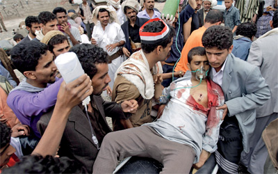 يمنيون يسعفون أحد أنصار الأحمر الذي أصيب برصاص الأمن في صنعاء. أ.ب