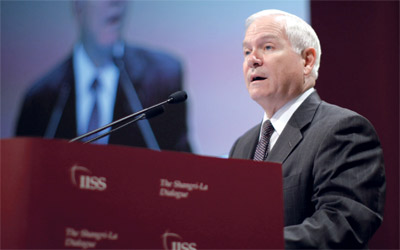غيتس خلال موتمر سنغافورة أمس. أ.ف.ب
