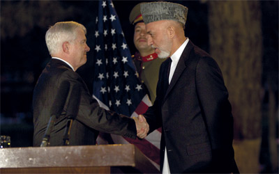 غيتس وكرزاي خلال مؤتمرهما في كابول. غيتي