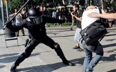 أخذت التظاهرات الاحتجاجية، المطالبة بإصلاح النظام الديمقراطي في إسبانيا، أمس، منحى عنيفا في برشلونة، عندما هاجم المتظاهرون نواب برلمان كتالونيا الإقليمي، وأصيب ما يزيد على 20 شخصا خلال الاشتباكات، فقد احتشد ما يزيد على 3000 متظاهر أمام حديقة سيوتاديلا دي العامة، حيث يقع مبنى البرلمان، لمنع نواب البرلمان من الدخول.