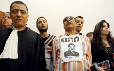 متظاهر تونسي يحمل صورة بن علي داخل قاعة المحكمة. رويترز