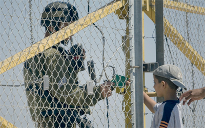 جندي إسرائيلي يفحص هويتي طفل فلسطيني ووالده. أ.ب