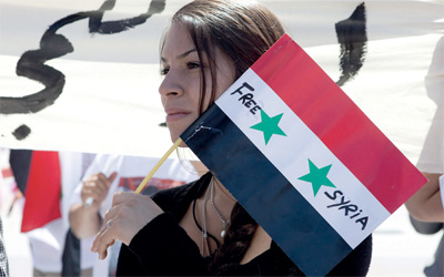 متظاهرة ترفع العلم السوري خلال احتجاج في جنيف. إي.بي.إيه