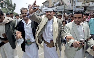 يمنيون يرقصون بالخناجر خلال تظاهرة مناهضة لصالح. أ.ب