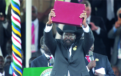 سلفا كير أحدث رئيس في العالم يرفع بيديه دستور جنوب السودان بعد أن وقعه باحتفال كبير في جوبا. أ.ف.ب