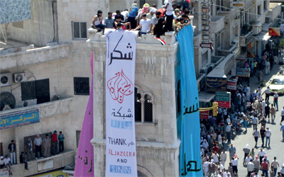 متظاهرون ضد النظام يعلقون لافتة في ساحة العاصي بمدينة حماة تشكر قناة الجزيرة وشبكة أخبار الشام. أ.ب