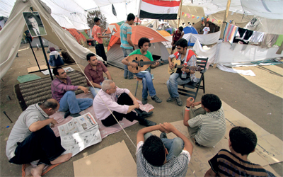 معتصمون في ميدان التحرير يعزفون الموسيقى ويطالعون الصحف. أ.ب