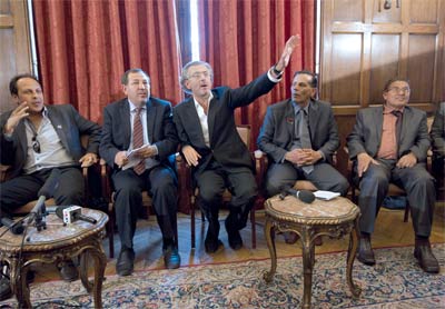 أعضاء من «الانتقالي» في لقاء مع الفيلسوف الفرنسي برنارد ليفي (وسط). أ.ف.ب