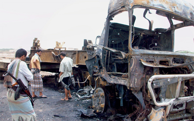 قتل تسعة عسكريين، وأصيب 21 آخرون، في هجوم بسيارة مفخخة نفذه انتحاري من تنظيم القاعدة، أمس، امام معسكر قوات الدفاع الجوي في عدن، كبرى مدن جنوب اليمن، حسبما افادت مصادر طبية وعسكرية، في حين قال مصدر أمني إن عدد الجنود الذين قتلوا وصل الى تسعة قتلى، والجرحى 34 جريحاً، وان العدد مرشح للارتفاع، بينما أعلن برلمانيان يمنيان عودتهما الى الحزب الحاكم، اثر محاولة اغتيال الرئيس علي عبدالله صالح، فيما توقع نائب الرئيس عبدربه منصور هادي التوصل نهاية هذا الأسبوع إلى خارطة طريق لحل المشكلات القائمة كافة، في بلاده، مؤكدا أن الحوار وحده هو المخرج الوحيد للأزمة، التي يعانيها اليمن.