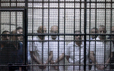 وزير الداخلية السابق حبيب العادلي (يسار) وعدد من مسؤوليه الأمنيين كما ظهروا في قفص الاتهام أول من أمس. إي.بي.إيه