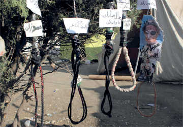 مشانق معلقة في «التحرير» وعليها أسماء مبارك ورجاله. أ.ب