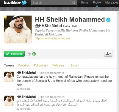 الصفحة الشخصية لصاحب السمو الشيخ محمد بن راشد آل مكتوم نائب رئيس الدولة رئيس مجلس الوزراء حاكم دبي على موقع "تويتر" وتظهر فيها دعوة سموه لمساعدة الشعب الصومالي.