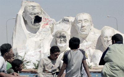 مصريون يستقلون شاحنة بالقرب من نصب لزعماء بمدينة 6 أكتوبر إذ يبدو وجه مبارك مشوهاً. أ.ب