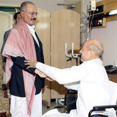 صالح يصافح رشاد العلمي بمستشفى الرياض. أ.ف.ب