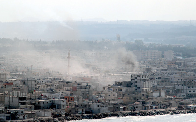 الدخان يتصاعد من مخيم الرمل الفلسطيني جنوب اللاذقية بعد قصفه من قبل السفن الحربية السورية. أ.ف.ب