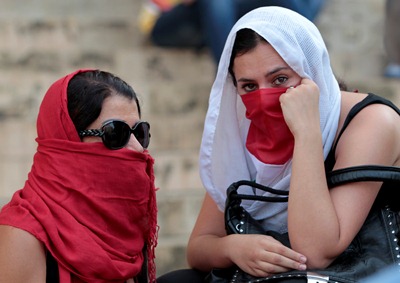 متظاهرتان تخفيان وجهيهما خلال تظاهرة مناهضة للنظام السوري في العاصمة اللبنانية بيروت-أ.ب