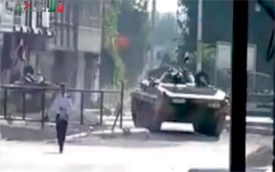 صورة بثتها شبكة شام تظهر دبابة وسط مدينة حمص. إي.بي.إيه
