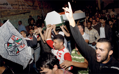 فلسطينيون غاضبون خلال تشييع الشهيد أمين دبش بالقدس. أ.ف.ب