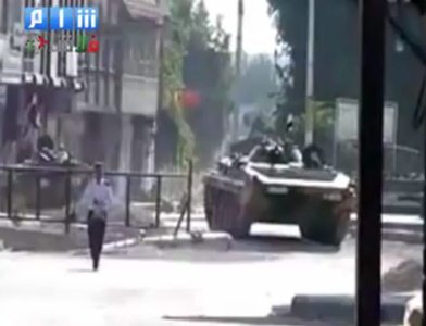 صورة من فيديو بثه نشطاء على الإنترنت تظهر فيها آلية عسكرية في أحد أحياء مدينة حمص أمس-أي.بي.ايه