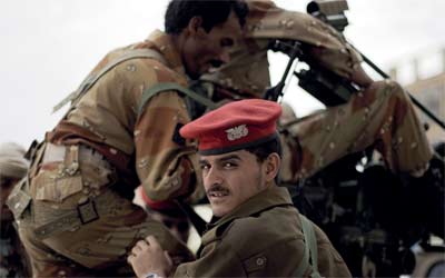جنود يمنيون يراقبون تجمعاً احتجاجياً ضد صالح في صنعاء. أ.ب