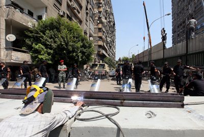عمال يشيّدون الجدار أمام السفارة الإسرائيلية في القاهرة-اي.بي.ايه