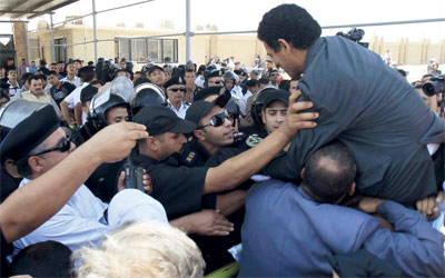 قوات الأمن المصرية تمنع محامين لم يحصلوا على تصريح بحضور المحاكمات أمس. رويترز