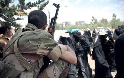 جنود يمنيون يتابعون مسيرة لطالبات جامعة صنعاء تطالب بمقاطعة الدراسة. إي.بي.إيه