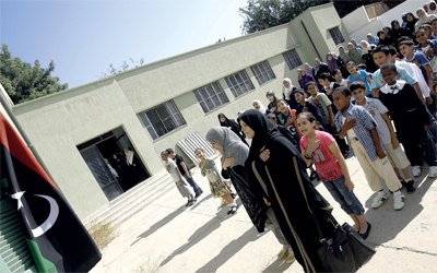 تلاميذ المدارس في طرابلس يبدأون عامهم الدراسي الجديد بتحية علم الثورة أمس. أ.ف.ب